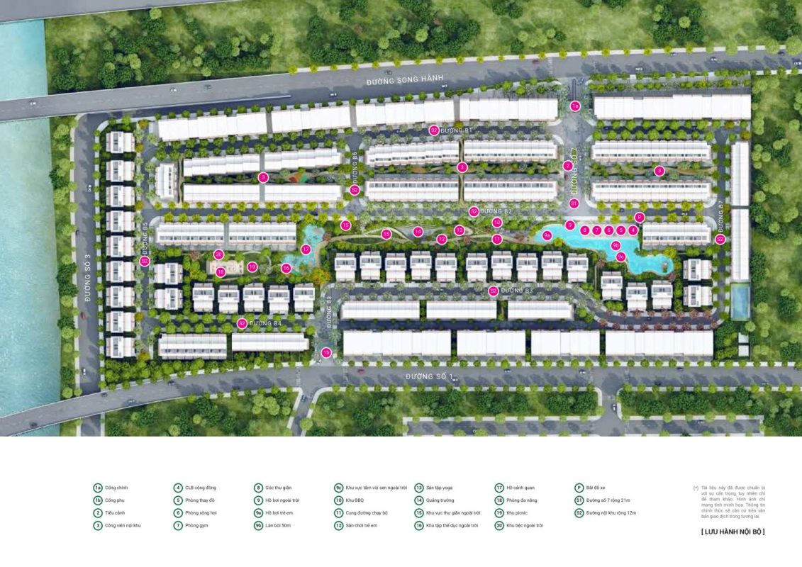 • Mật độ xây dựng: Thấp, ưu tiên không gian xanh và công viên