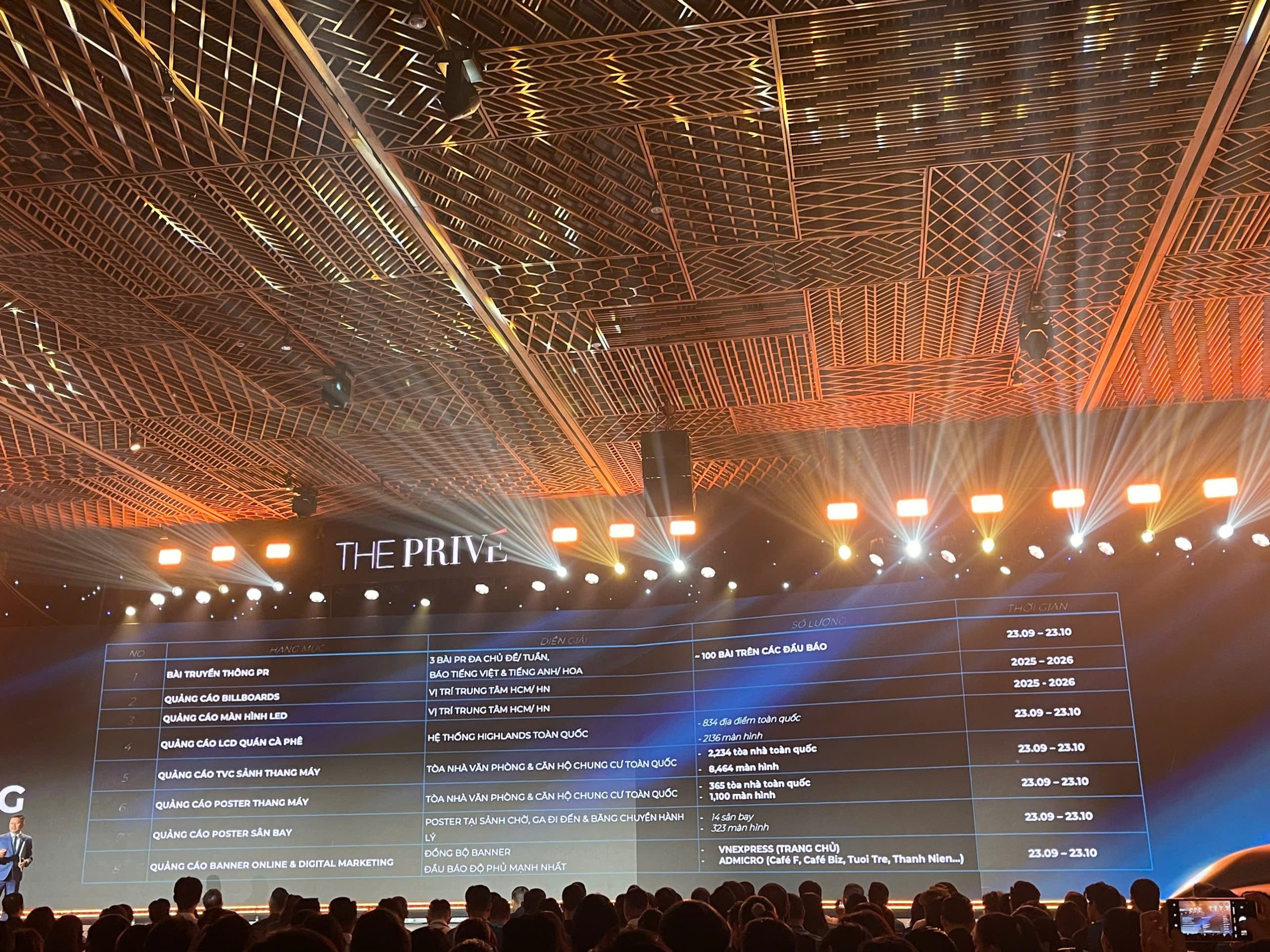 Không chỉ dừng lại ở sản phẩm The Privé, chủ đầu tư còn đẩy mạnh chiến dịch truyền thông quy mô toàn quốc. Hàng loạt kênh quảng bá được triển khai đồng loạt: Google, Facebook, TikTok, YouTube, billboard ngoài trời, màn hình LED tại các trục đường lớn TP.HCM – Hà Nội, TVC sảnh thang máy, poster tại sân bay…. Đây là lần hiếm hoi một dự án bất động sản cao cấp tại Việt Nam được truyền thông đa kênh với mức độ phủ sóng rộng lớn như vậy.